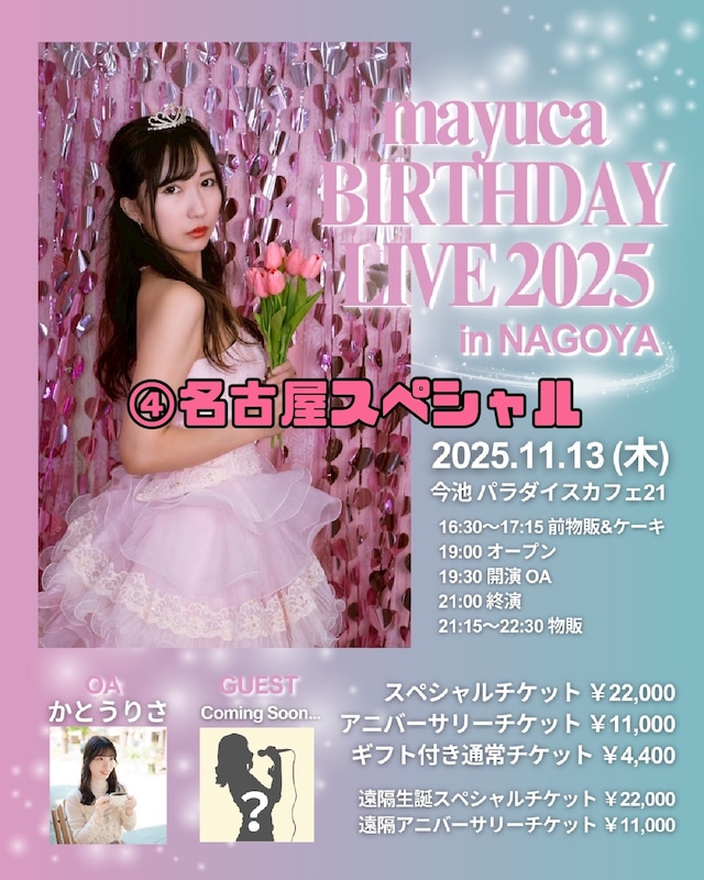 ①11/13(水)名古屋生誕スペシャルチケット ¥22000 特典 •バースデーパーティー参加券(ケーキ) •当日衣装サイン付きソロチェキ •まゆたんからの直筆お手紙 •メッセージ入りライブセトリカード •当日ライブ映像アーカイブ(特典映像付き) •パティシエ手作りお菓子とオリジナルドリンクプチギフト •ガチャ1回無料券 ※チケット現物はありません。 当日お名前で入場可能です。 ※クリックポスト¥300はネット決済手数料としてご了承ください。